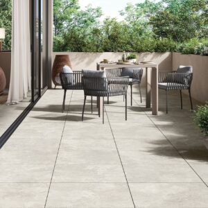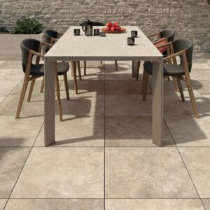 This large format slab paver resembles the natural texture of travertine, offering a smooth finish in softer cross cuts colors.